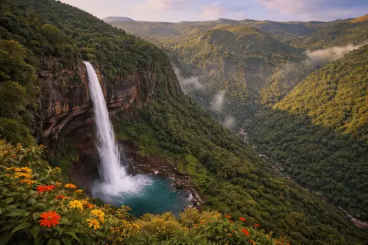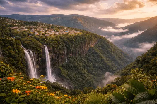 Nohkalikai Falls is one of the most breathtaking places to visit in Meghalaya. It is the tallest plunge waterfall in India, falling from a height of around 340 meters. Located near Cherrapunji, this waterfall is surrounded by lush green hills and deep valleys.