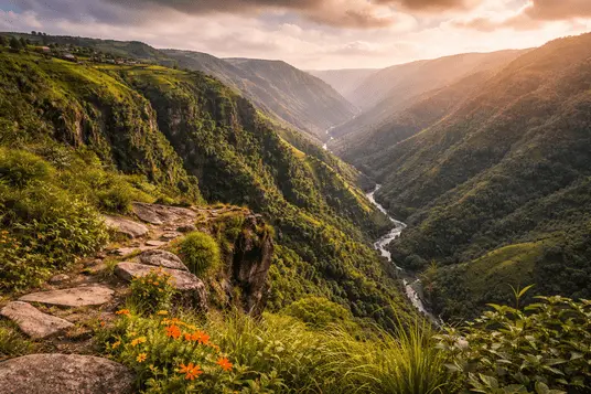 Laitlum Canyon is one of the most scenic and offbeat Best Places to Visit in Meghalaya. It is known for its breathtaking views of deep valleys, rolling hills, and endless greenery.